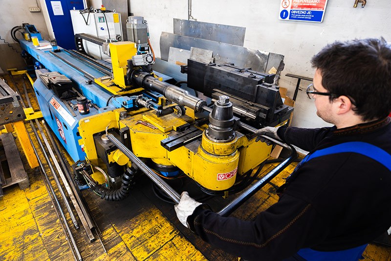 For bending tubes we use Crippa Linear CA 563 machine. It is suitable for use in the furniture, automotive as well as aerospace industries. This machine has five axes and is fully CNC controlled, and driven by digital electrical motors. Maximum diameter of tube bending is 60.3 mm and usable length of the tube is 5500 mm. The machine can also bend products, which have a variable angle with option of bending into helix.